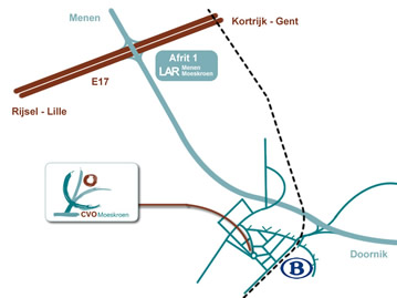 Volg de E17 richting Kortrijk-Rijsel (Lille) en neem Afrit 1 Moeskroen naar links.